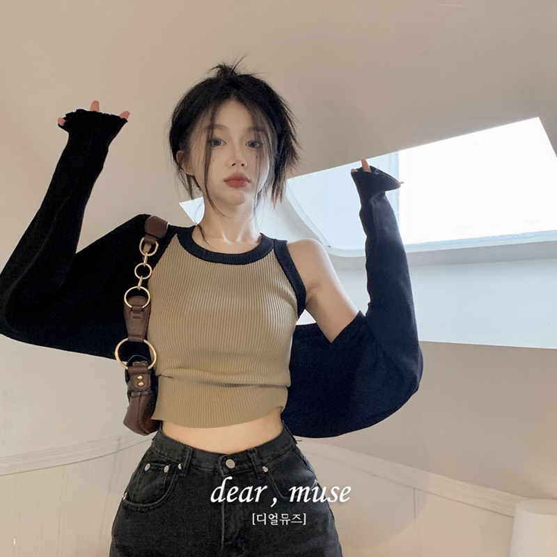 카리나 배색 민소매 나시 탑 긴팔 니트 볼레로 가디건 세트 (베이지, 블랙) (별도구매 가능)