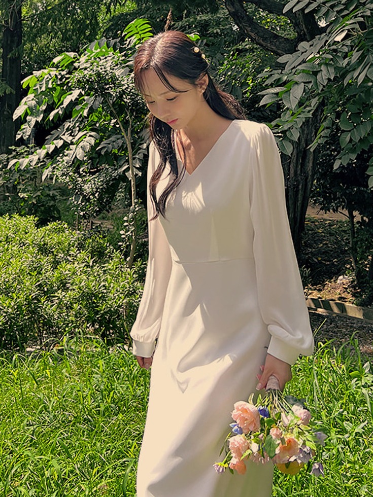 [2천장 돌파✨][44-110] [웨딩룩] 플레니 브이넥 셔링 롱 원피스 ( 봄-가을-러블리룩-페미닌룩-격식룩-데이트룩-브라이덜샤워-자체제작-빅사이즈-110사이즈-슬림핏 )