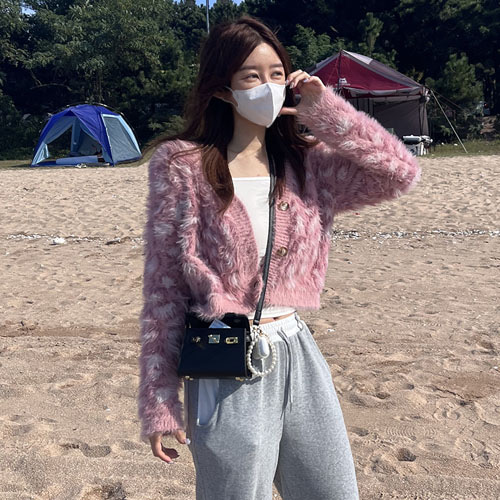 핑크 호피 앙고라 니트 페이크퍼 크롭 숏 긴팔 가디건