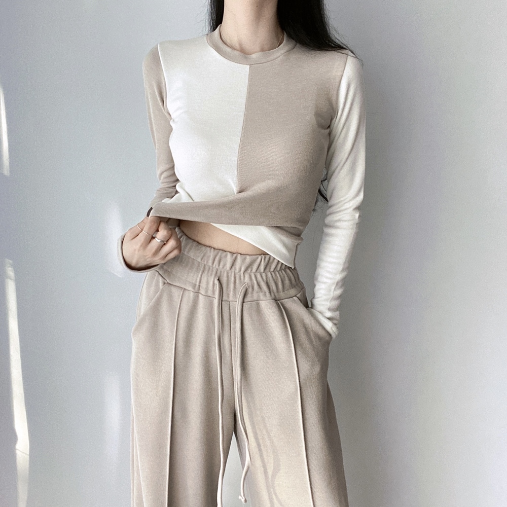 [슬림섹시/유니크] 하프 배색 꼬임 크롭 티셔츠 2color 도톰 착붙핏 절개 믹스 엑스 스판