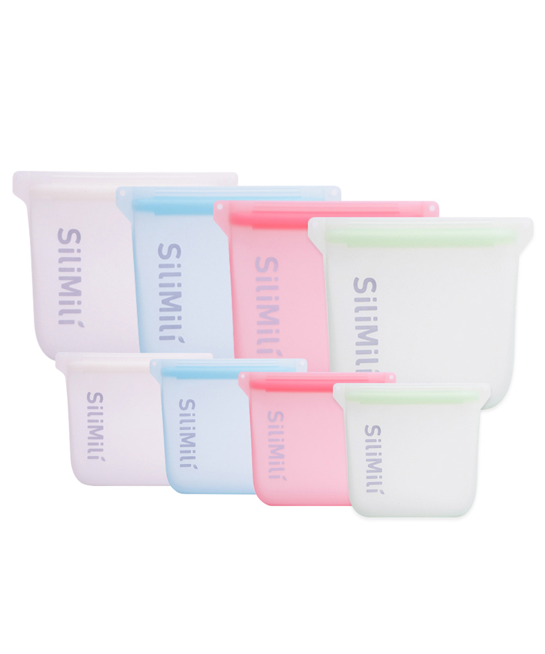 [실리밀리] 오리지널 스탠딩 실리콘 지퍼백 8종 세트 (500ml 4개+1000ml 4개) (전자레인지,소분,냉동,열탕)