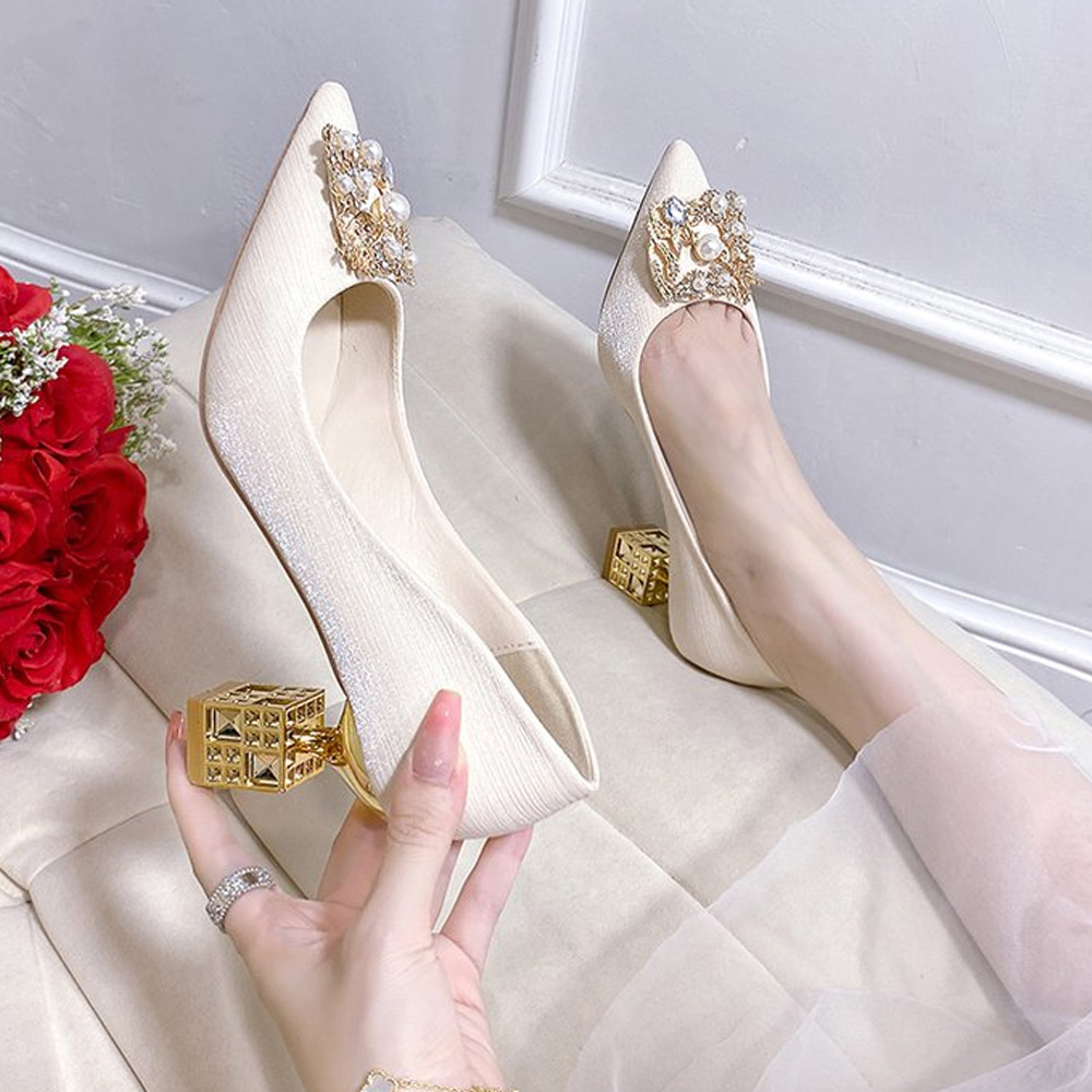 레니트 6,8cm 뾰족코 새틴 통굽 진주 결혼식 웨딩구두 1color