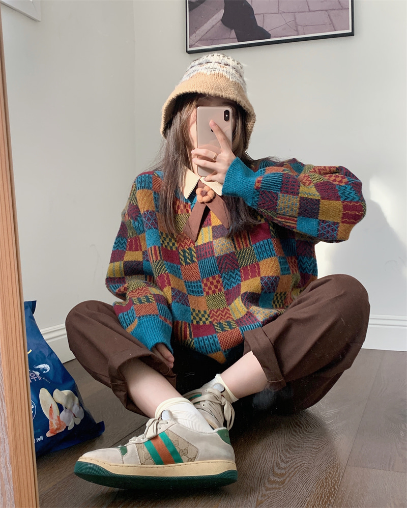 [♥팬츠/스웨터/당일발송][코디추천] 복고풍 배색 패치 체크 패턴 니트 브라운 스웨터 맨투맨 + 브라운 스트레이트핏 바지 + 리본 셔츠 블라우스 남방 봄 가을 신상 꾸꾸 겨울 238029-76