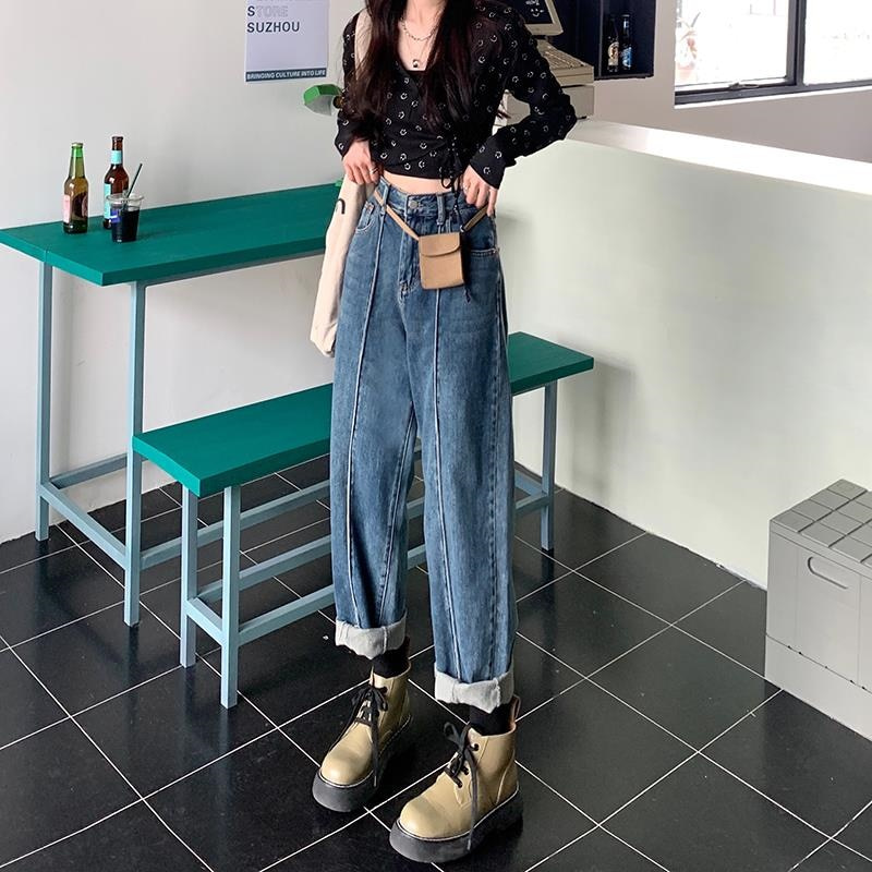 레트로 복고풍 일자핏 와이드핏 하이웨이스트 얇은 루즈핏 워싱 데님진 빈티지 밑단 커팅 헤짐 스트릿 감성 봄 가을 통넓은 청바지 롤업 데님 진 캠퍼스 홍대 합정 스타일 데이트룩