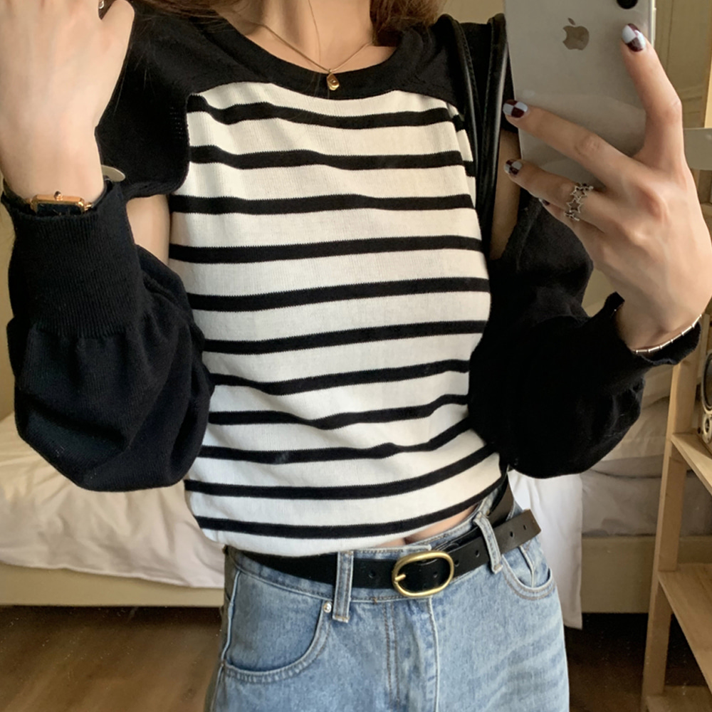 스트라이프 줄무늬 단가라 트임 니트 꾸안꾸 크롭 숏 키작녀 맨투맨 롱슬리브 티셔츠 슬림핏 슬렌더 여리 데이트 여친룩 러블리 귀여운 캐주얼 대학생 새내기 화이트 블랙 브라운