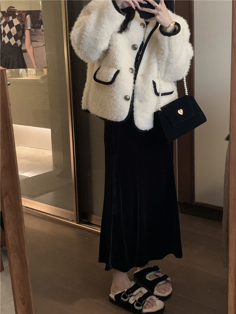 전시회 미술관룩 배색 라인 양모 코트/머메이드 라인 롱 스커트 코디세트