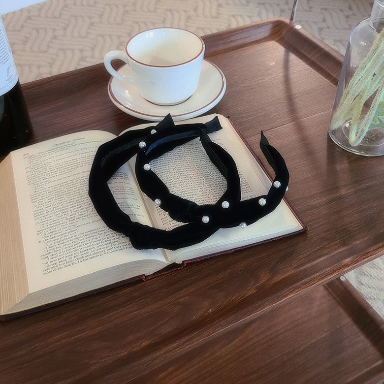 [블링살롱made/국내제작] 메리 진주 매듭 벨벳 머리띠 슬림 헤어밴드 셀프웨딩 블랙 드레스 파티용 백설공주 머리띠