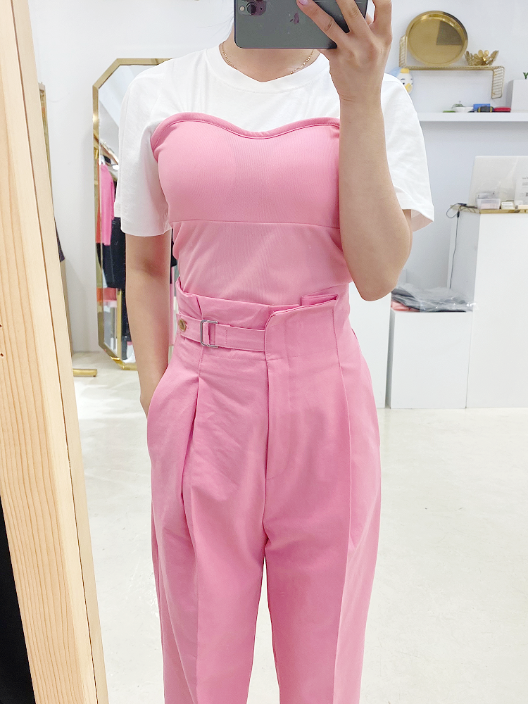 가슴 패드 샤론 튜브탑 레이어드 반팔 크롭 이중 티