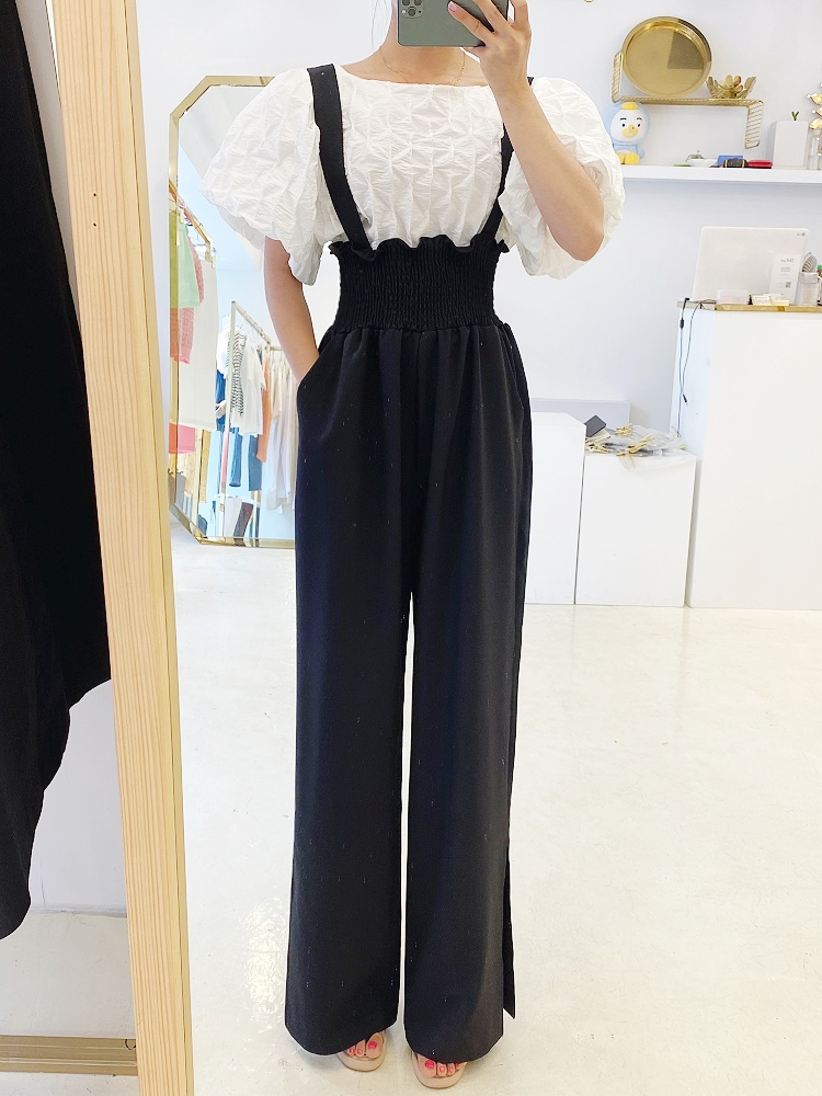 스모크 멜빵 일자 와이드 통 트임 슬랙스 점프수트