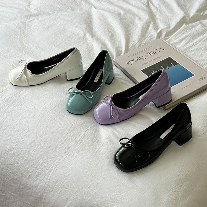 HS1555 라운드 콤비 에나멜 리본장식 펌프스 힐 4.5cm