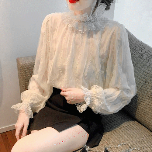 [20대겨울신상/하객룩]레이스 블라우스 플라워 펀칭 자수 긴팔셔츠 밴딩소매 레이어드 시스루 정장이너 12월 결혼식 하객룩 데이트룩 빅사이즈 쉬폰 블라우스
