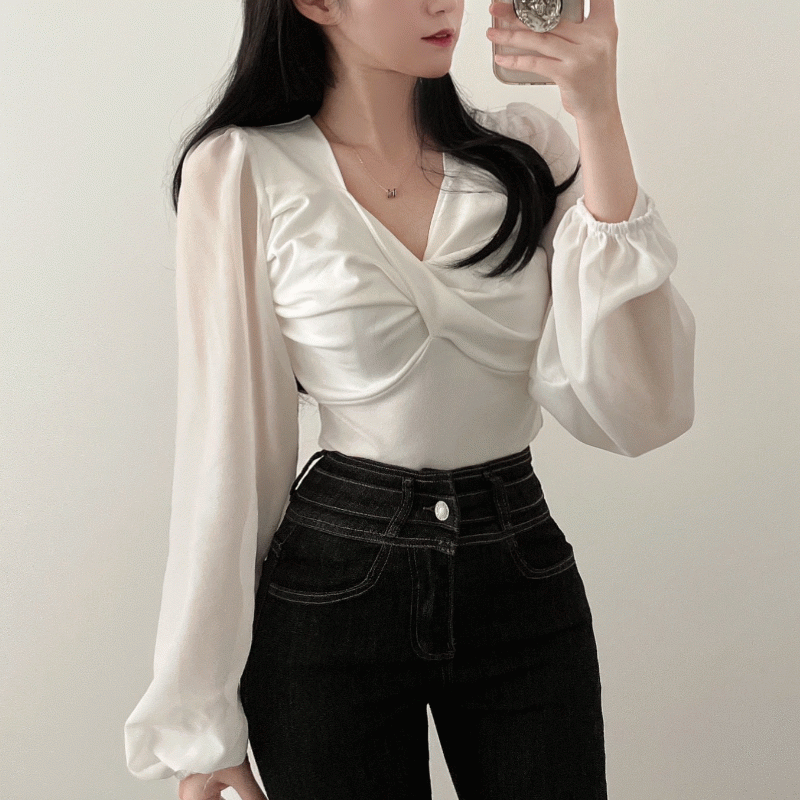 [핏예쁨! / 증명사진 블라우스 ] 아이린 꼬임 니트 시스루 쉬폰 블라우스 (증명사진/출근룩/페미닌룩)