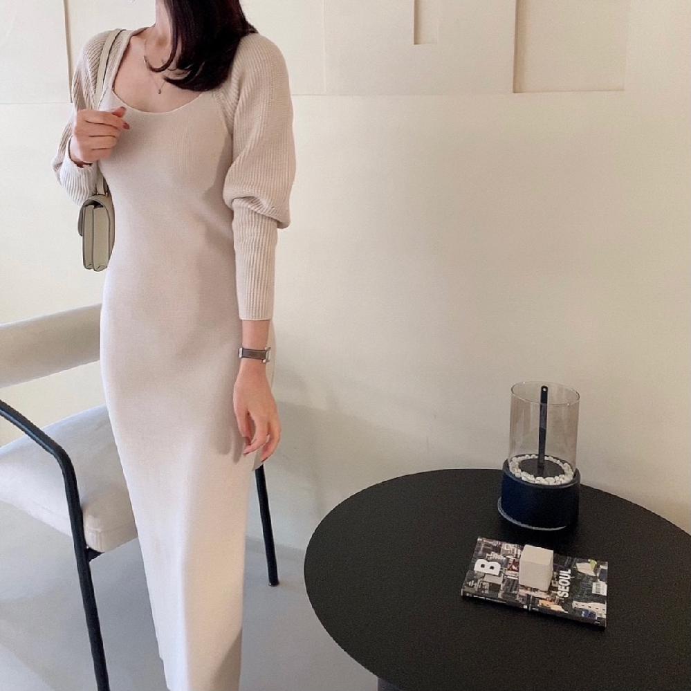강추 하찌 스퀘어넥 퍼프 소매 볼륨 니트 롱 원피스