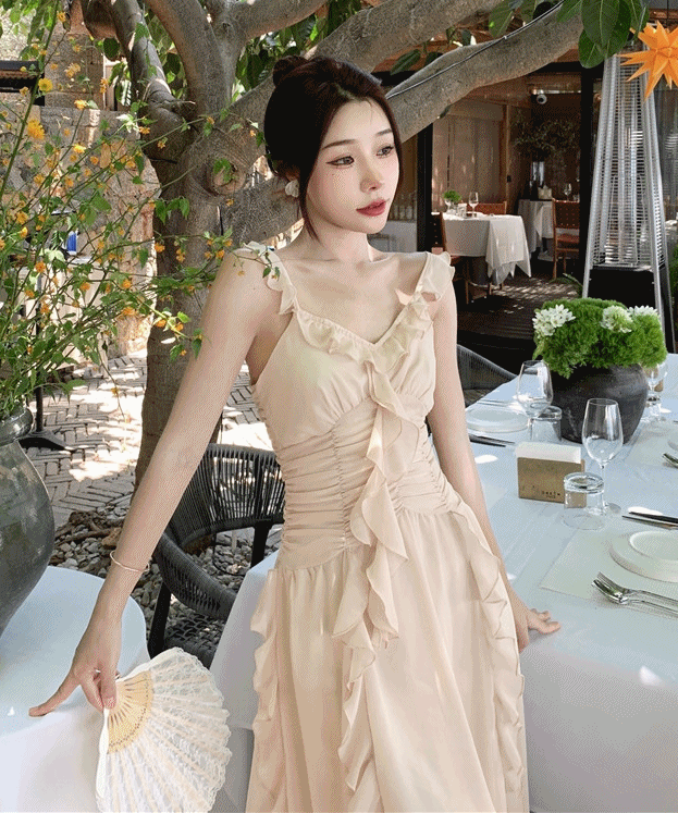 여름 휴양지 비치 휴가룩 바캉스 슬리브리스 하늘하늘 프릴 소녀 공주 러블리 쉬폰원피스