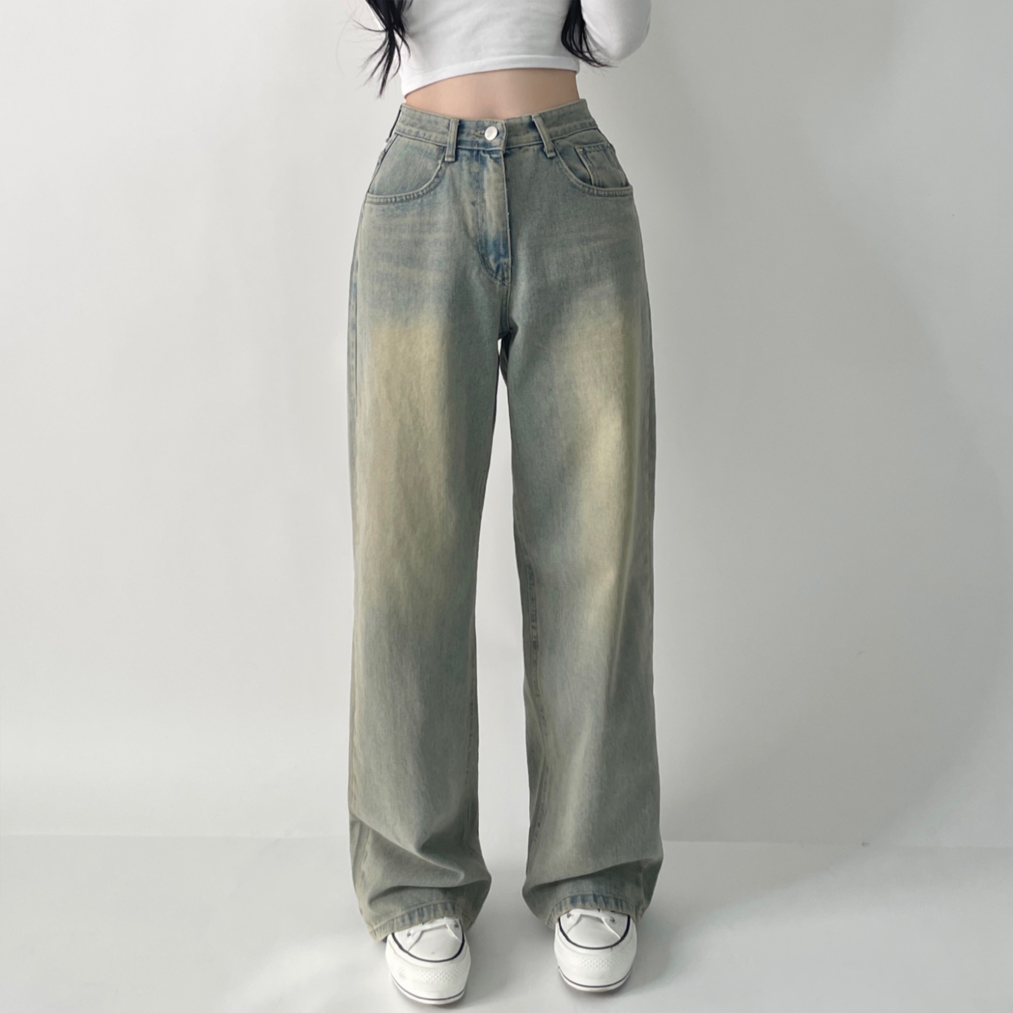 [색감깡패..💓] 레트로 옐로우 워싱 연청 세미 로우라이즈 오버핏 데님 브러쉬 와이드 팬츠