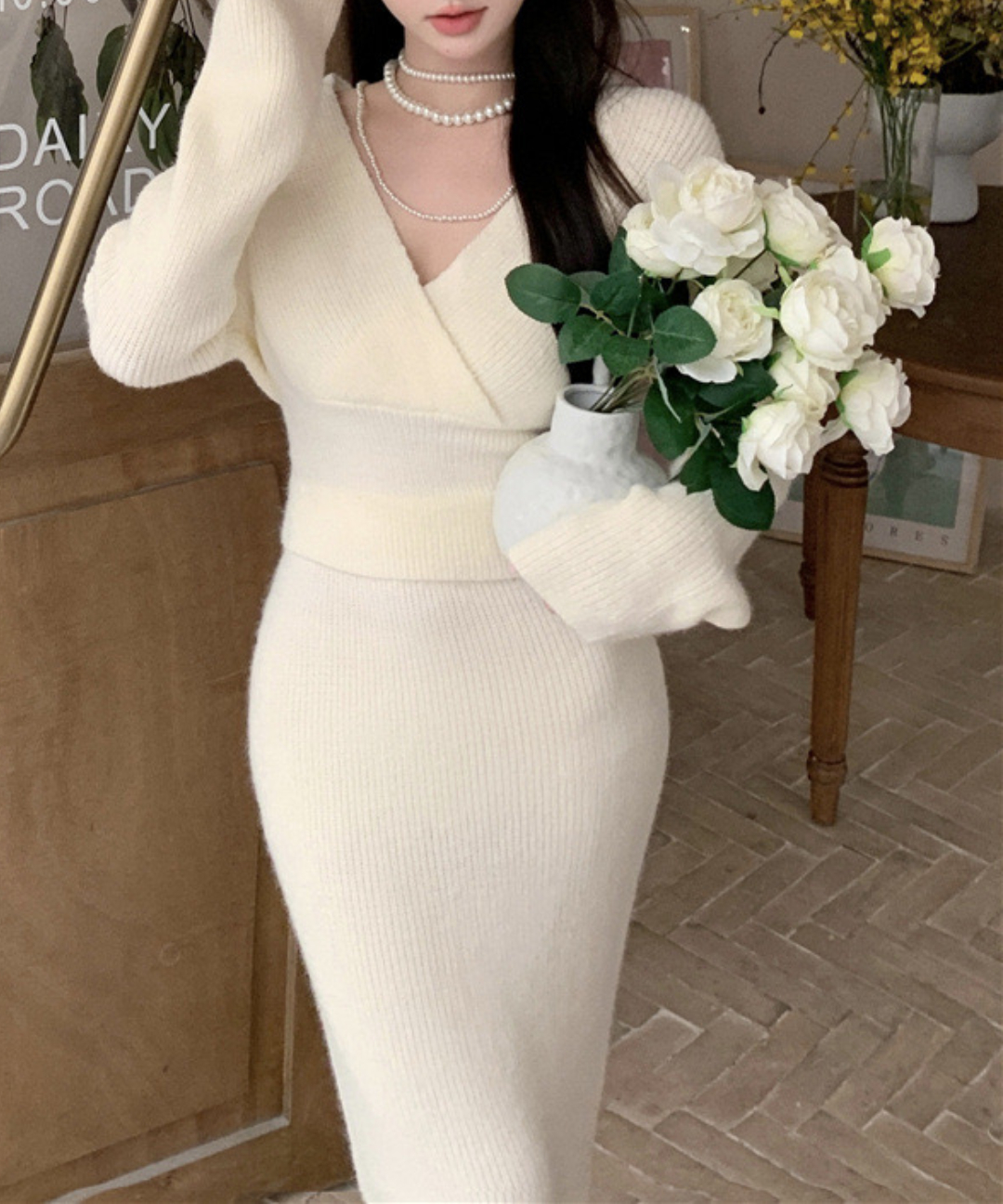 [고퀄/존예] 아메이드 골지 브이넥 오프숄더 니트 롱스커트 투피스 세트