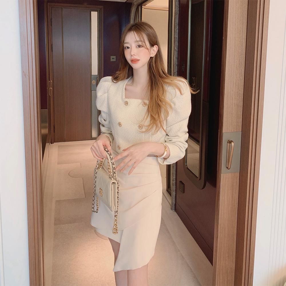 [델리썸] 시어 트위드 퍼프소매 골드버튼 크롭 숏 자켓 2COL