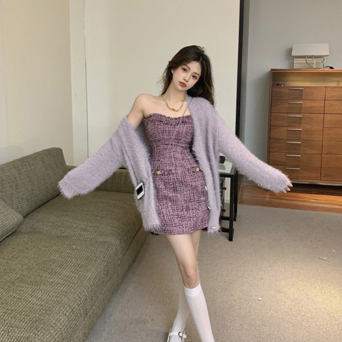[데이트룩] 딥퍼플 트위드 탑 원피스 연보라 가디건 코디 셋업룩 하객룩 SST-325