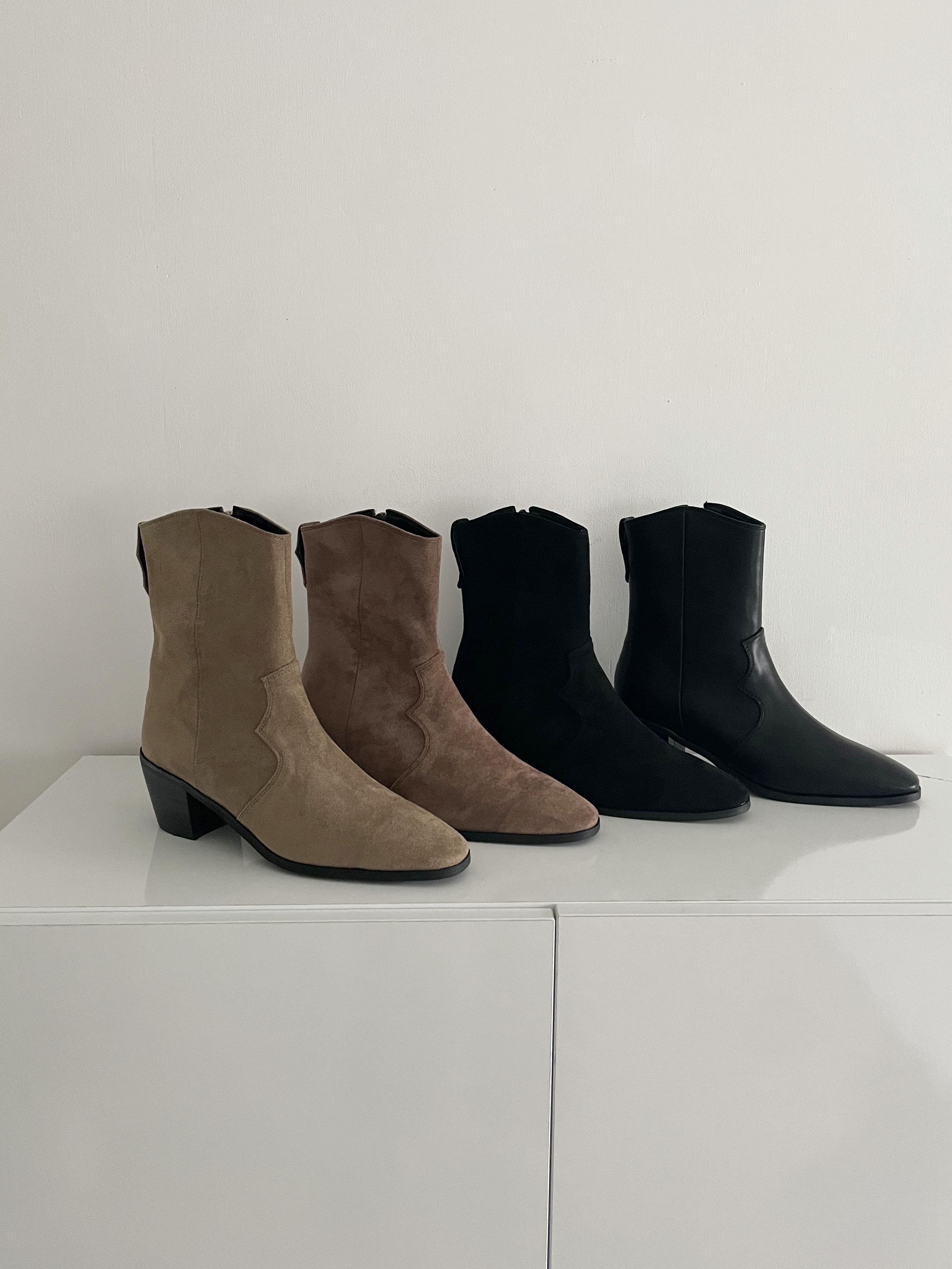[ 가죽 / 스웨이드 ] 둥근 스틸레토 미들굽 숏 앵클 웨스턴부츠 ( 5.5cm )