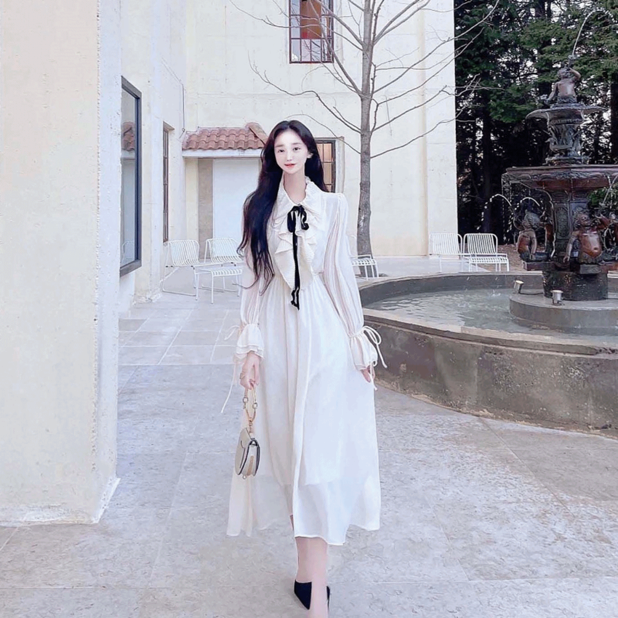 [당일발송,저퀄리티X,블랑시리즈n.2] 블랑 아이보리 리본 플리츠 프릴 쉬폰 기모 안감 롱 원피스 (good quailty - 봄 모임룩 데이트룩 데일리 원피스)