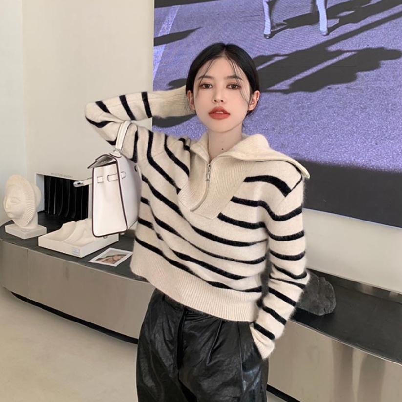 [빠른출발🚀반집업니트] 반집업 스트라이프 니트 기모 겨울 니트 집업 이너 스웨터