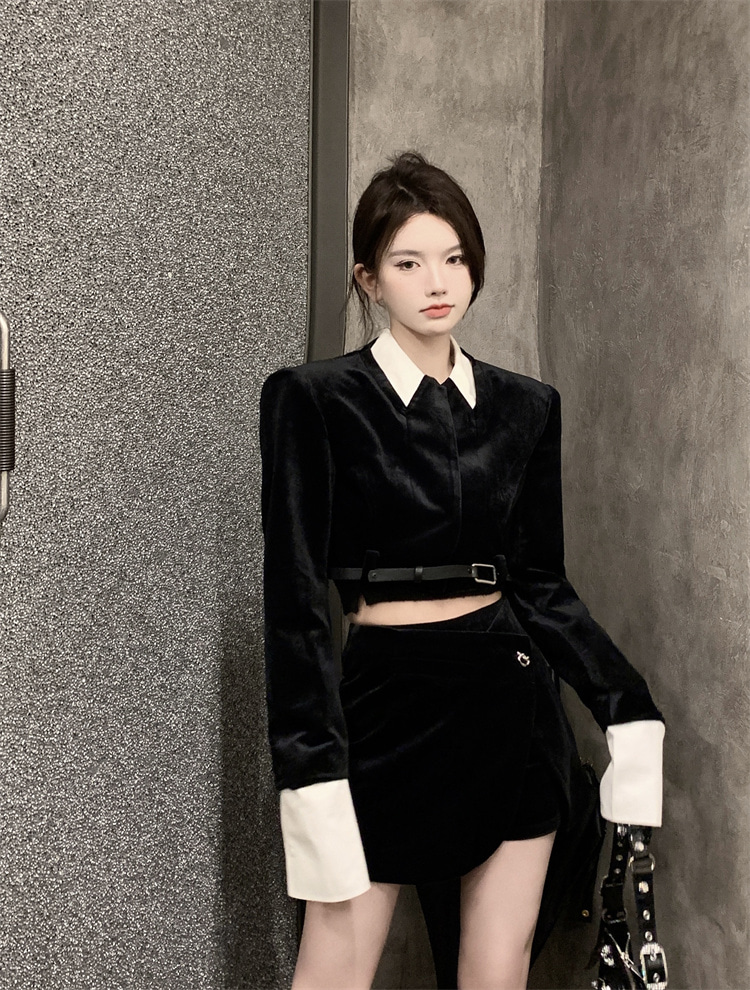 시크룩 벨벳 커프스 크롭 상의/하이웨스트 벨벳 미니 스커트 코디세트