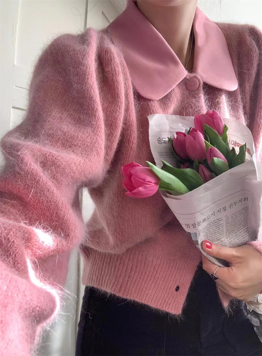 앙고라 토끼털 새틴 빅카라 퍼프 셔링 울니트 크롭 가디건 6color