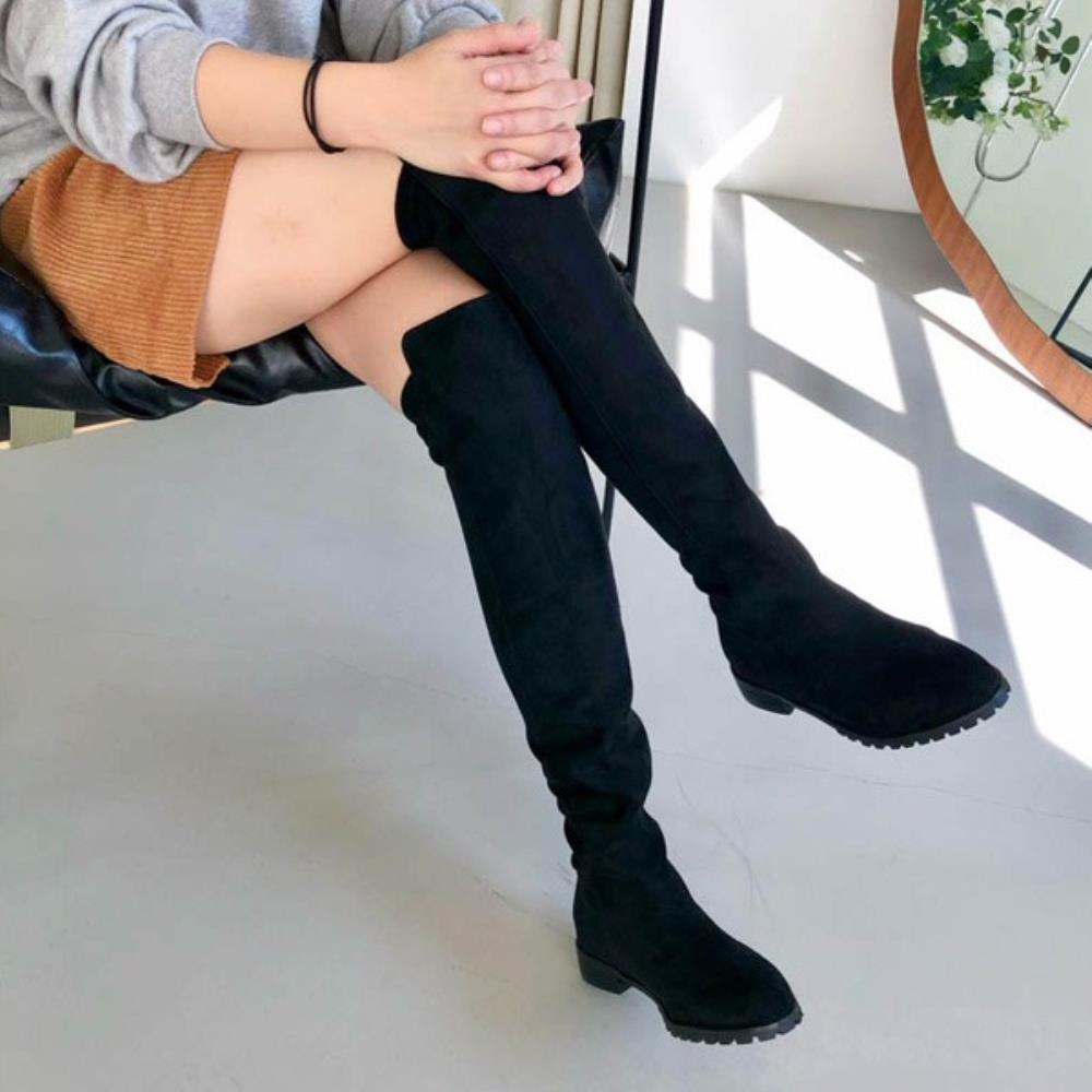 여자 무릎 니하이 플랫 세무 겨울 홀리데이 롱부츠