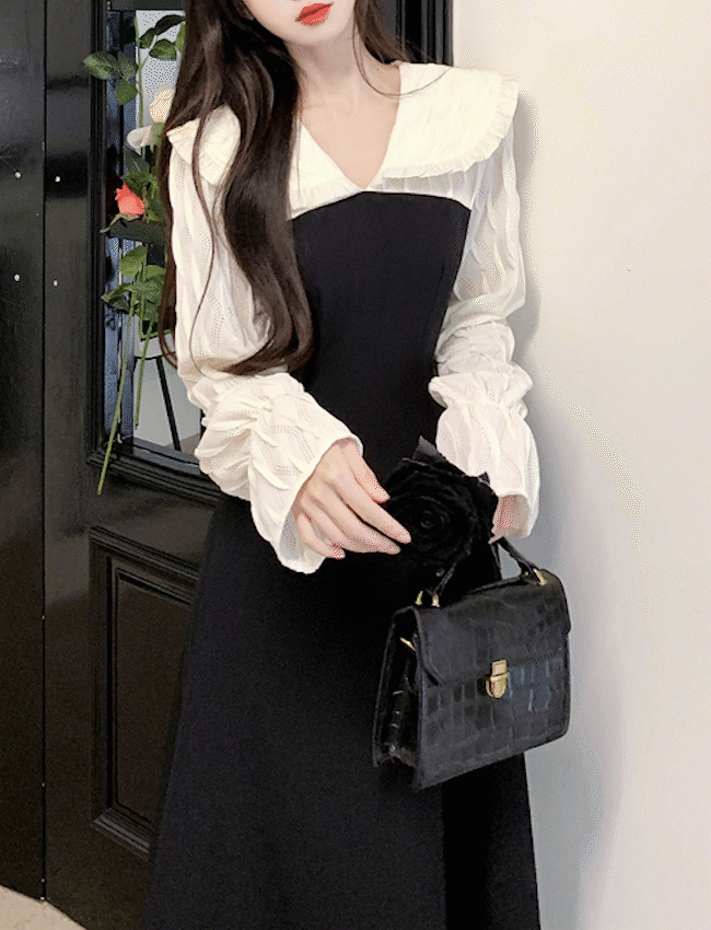 [겨울원피스/20대하객룩]빅사이즈 여성 정장원피스 브이넥 레이어드 셔츠원피스 77 88 12월결혼식 직장인룩 데이트룩 검정롱원피스 나팔소매 플레어스커트