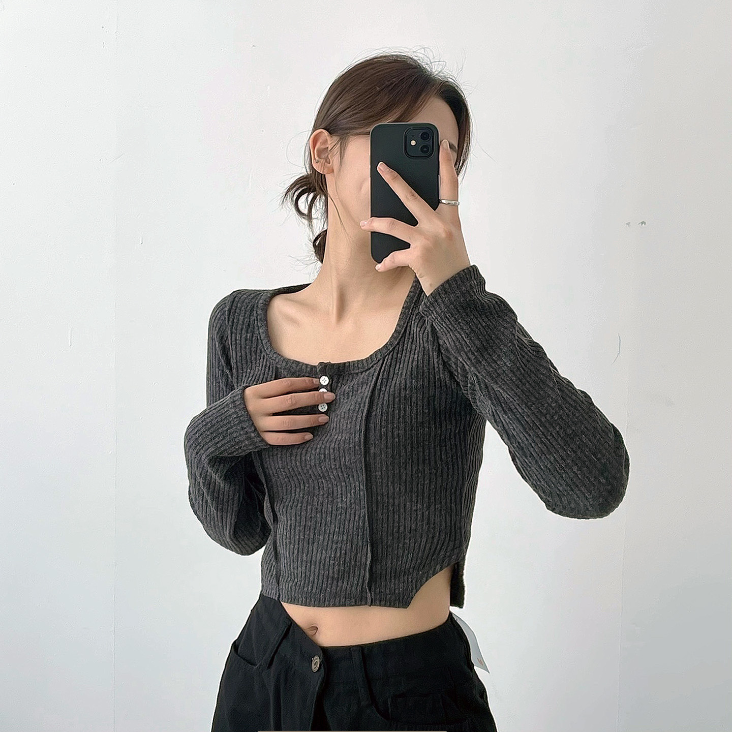 [허리뽀인트!]날씬해보이는,링크 단추 허리 스퀘어넥 크롭티