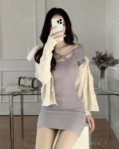 🧚🏻♀️분위기여신 🧚🏻♀️[몸매보정/핏보장] 블룸 글램 폭닥 엑스 스트랩 골지 니트 긴팔 미니 원피스 스커트