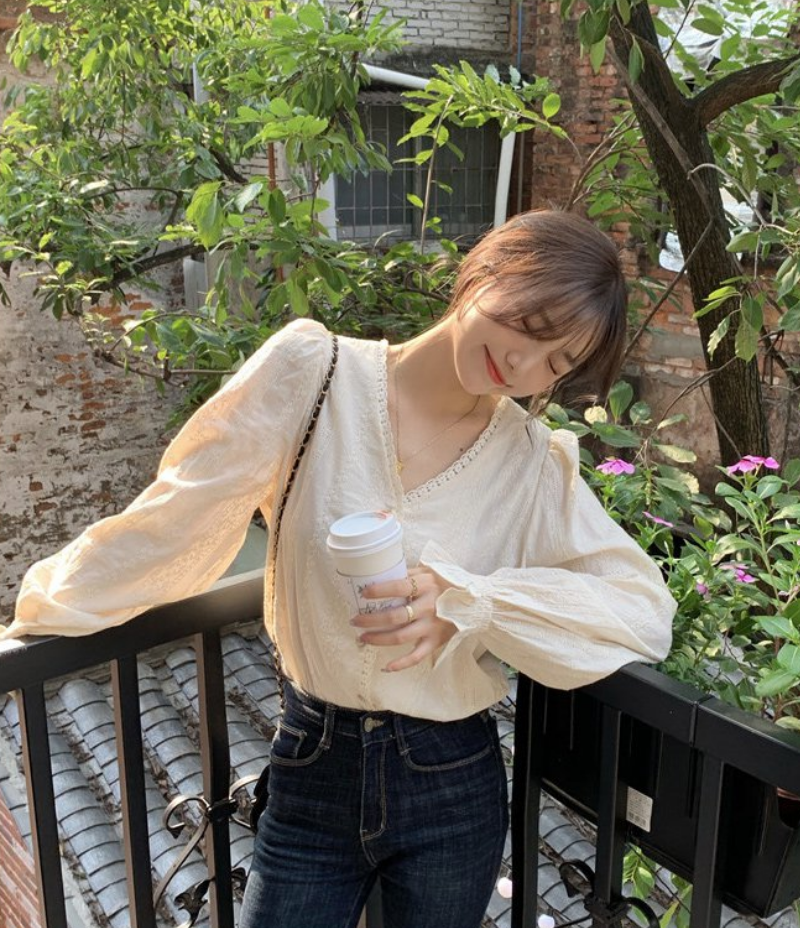 패션핏 프릴퍼프 사랑스러운 블라우스 청바지코디룩