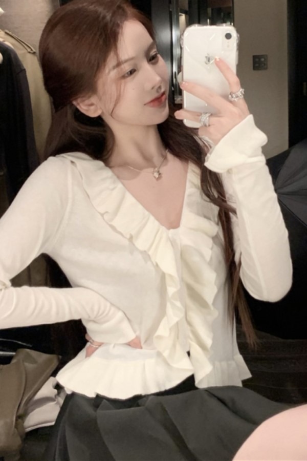 로키 프릴 브이넥 긴소매 롱슬리브 니트 스웨터