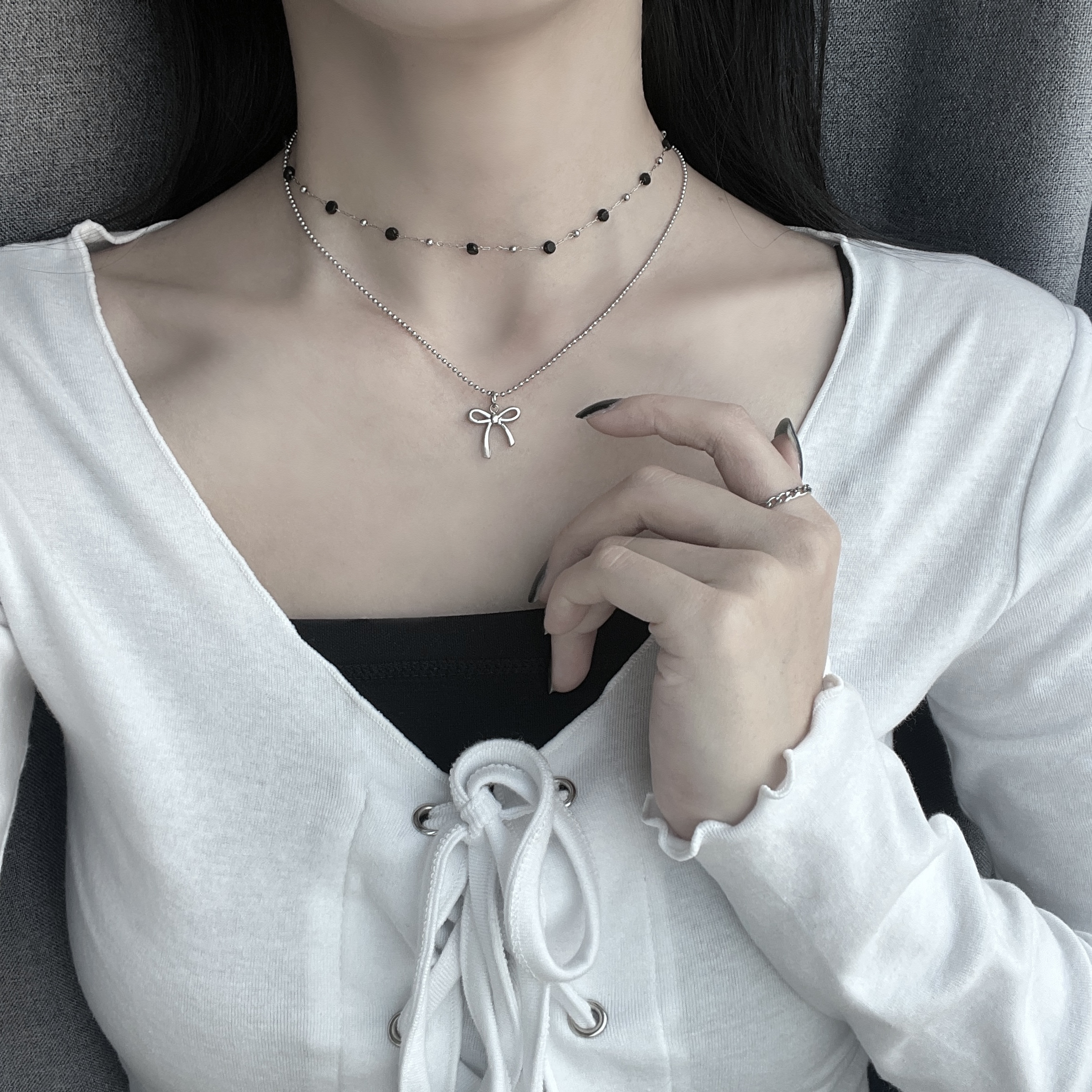 [자체체작/써지컬스틸] 리본 발레코어 포인트 키치 투 체인 무채색 목걸이