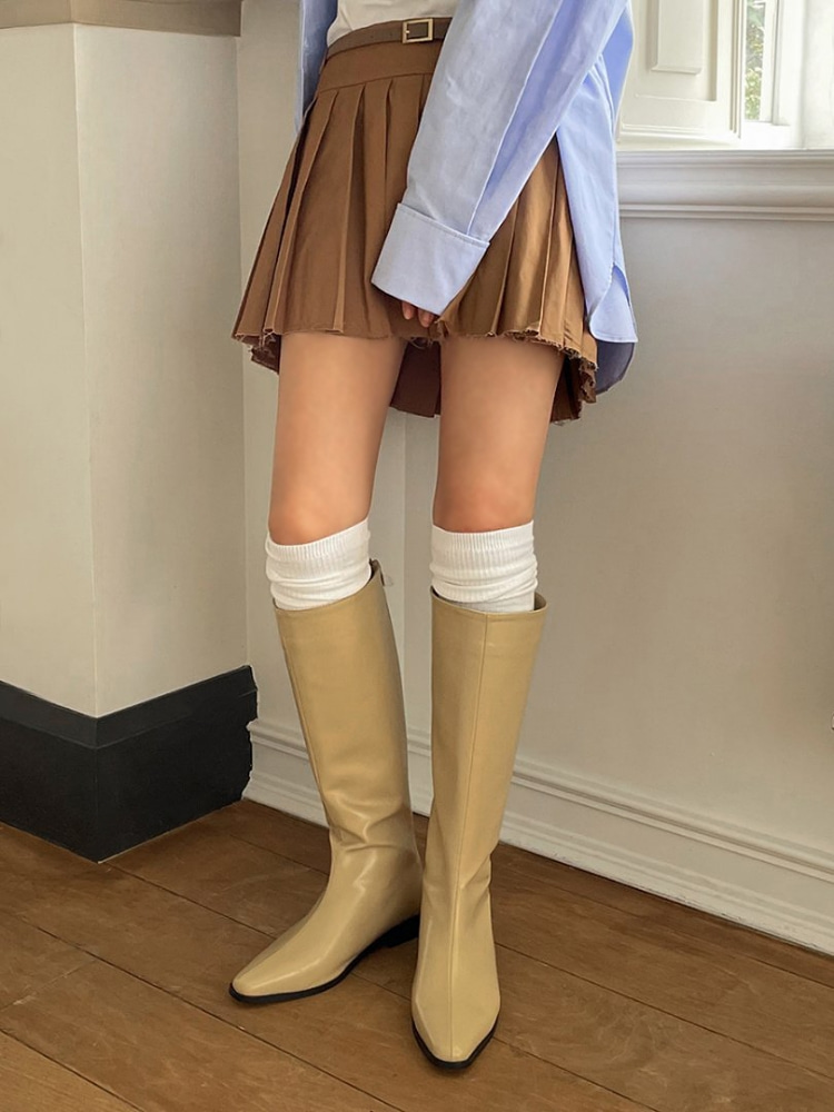 브레헨 가죽 절개 슬림 스퀘어 플랫 롱 부츠 2.5cm