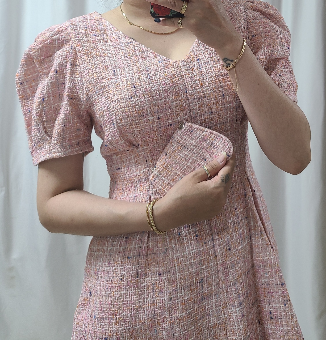 [모델소장] 핑크트위드원피스 하객룩 데이트룩 여성원피스 여자원피스 트위드원피스 하객룩원피스 하객원피스 결혼식하객원피스 결혼식하객룩코디 여신원피스 반팔트위드원피스