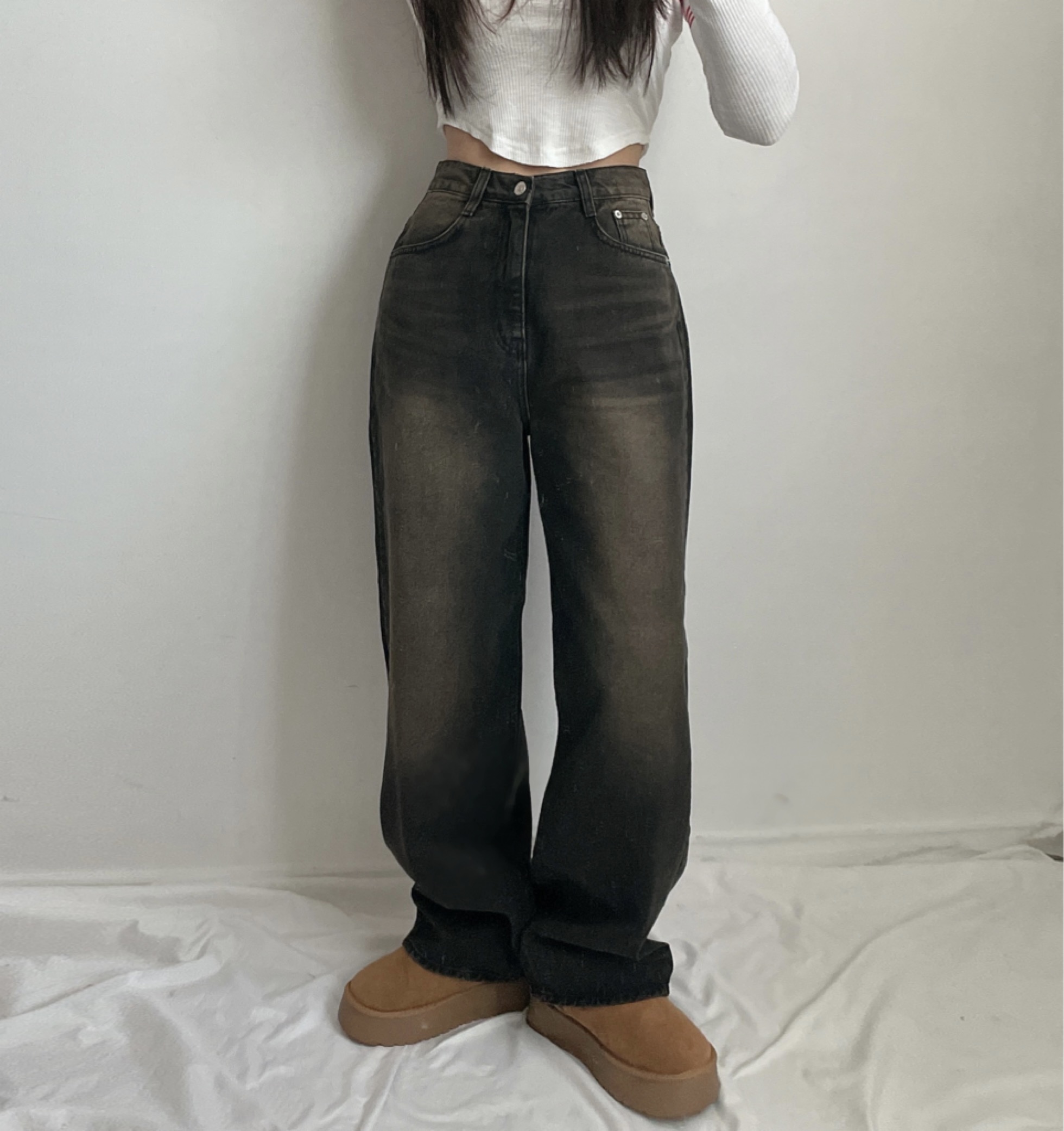 빈티지 브라운 워싱 와이드 블랙 데님 팬츠 1color