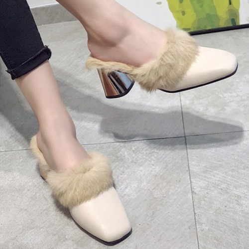 S613 겨울 사각코 퍼 트리밍 블로퍼 단화 로퍼 퍼슈즈 심플 데일리 금장 통굽 뮬힐 빈티지 정장 캐주얼 구두 미들힐 털 슬리퍼 7cm