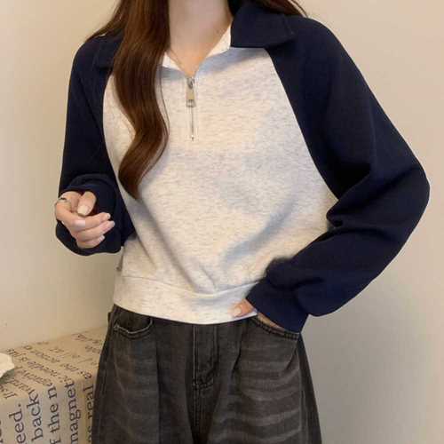 네이비 나그랑 반집업 카라 여성 심플 긴팔 티셔츠 J10