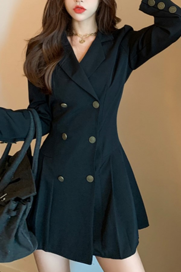 포이 더블 브레스트 브이넥 긴소매 롱슬리브 미니 정장 원피스