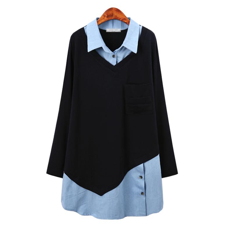 허밍퍼플 여성용 8457-DO 청 배색 남방 빅사이즈 청 카라 셔츠 남방 단추 단정한 오버 플러스 심플 여자옷 예쁜 여성의류