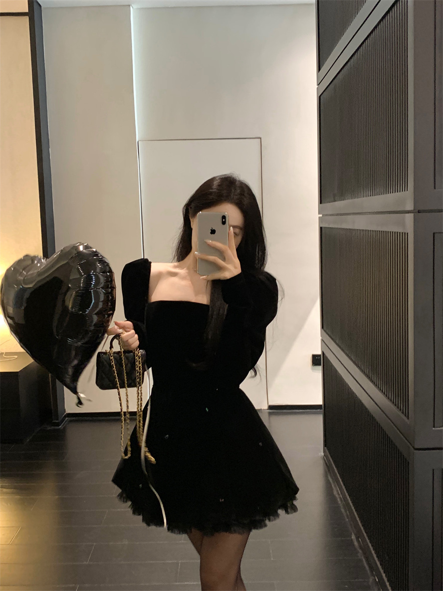 생일파티룩 스퀘어넥 퍼프 미니 벨벳 드레스 파티/이벤트/크리스마스
