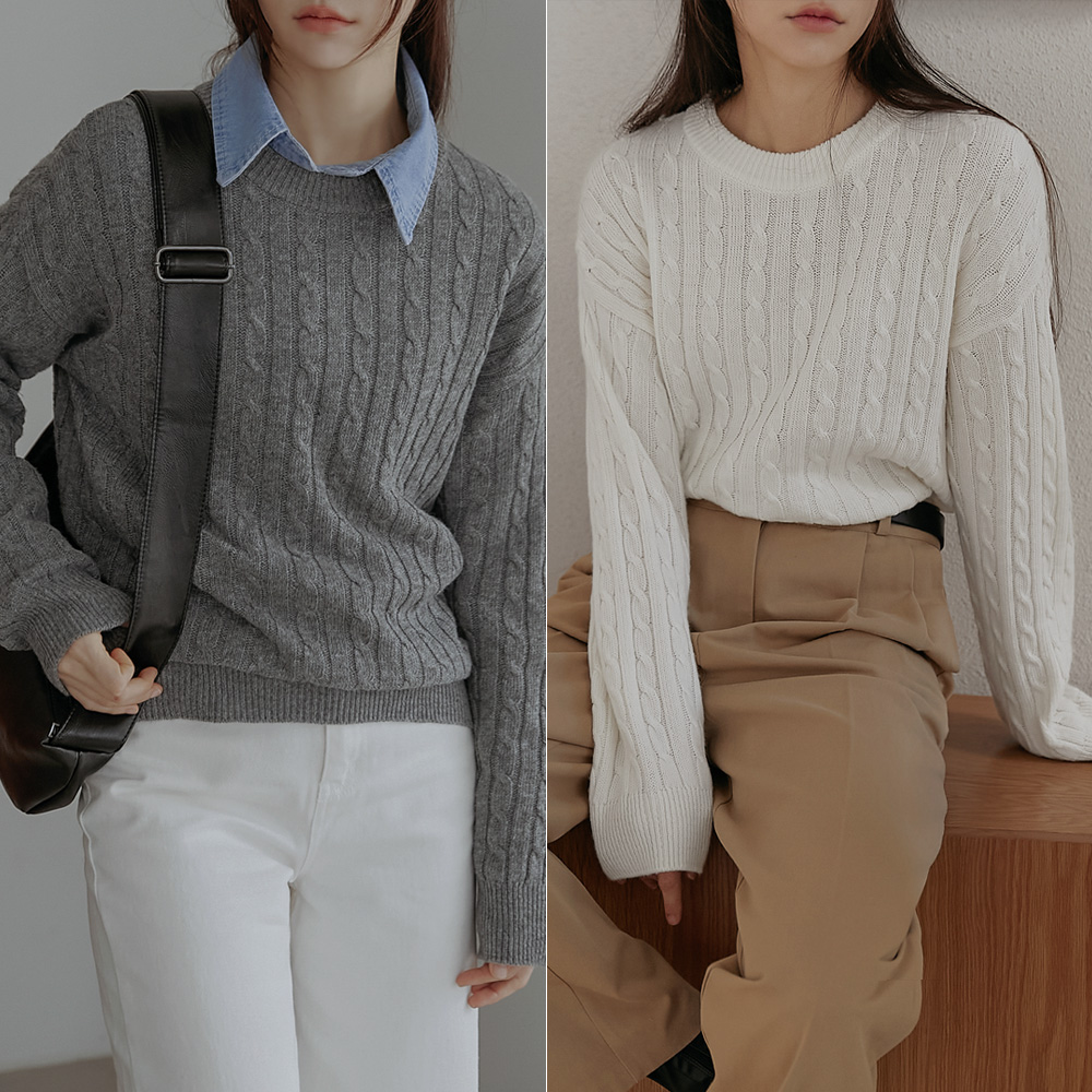 프리마 케이블 라운드 니트 (가을/간절기/라운드넥/루즈핏/캐시라이크/긴팔/레이어드/출근룩)