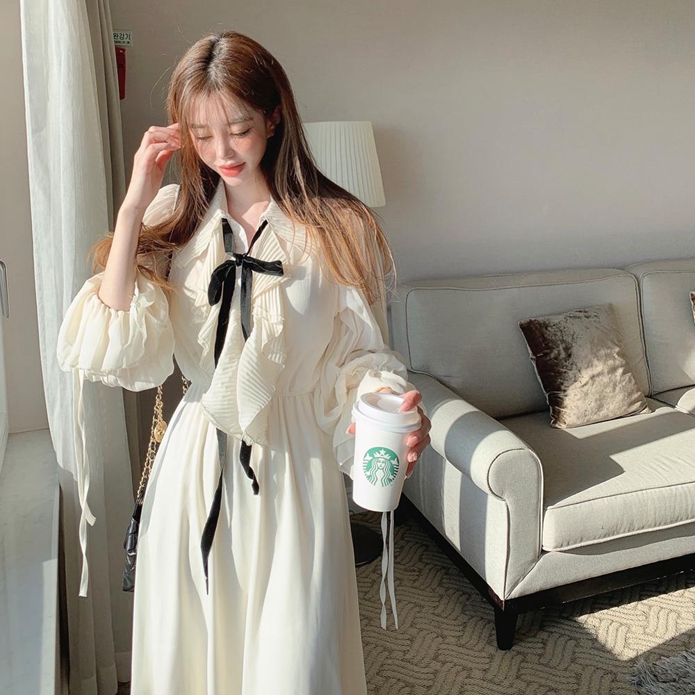 [델리썸] 원스 쉬폰 플리츠 리본 롱 원피스
