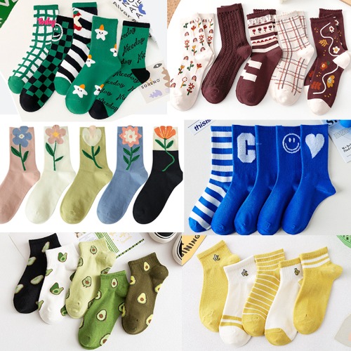[5SET]✨22종 양말세트 발목 단목 중목 장목 긴목 양말 패션 유니크 특이한 양말 봄 여름 가을 겨울 캐릭터 재밌는 귀여운 곰돌이 스마일 동물 꽃무늬 플라워 레이스 프릴 체크무늬 여성 성인 학생 양말 앵클 삭스 인싸템
