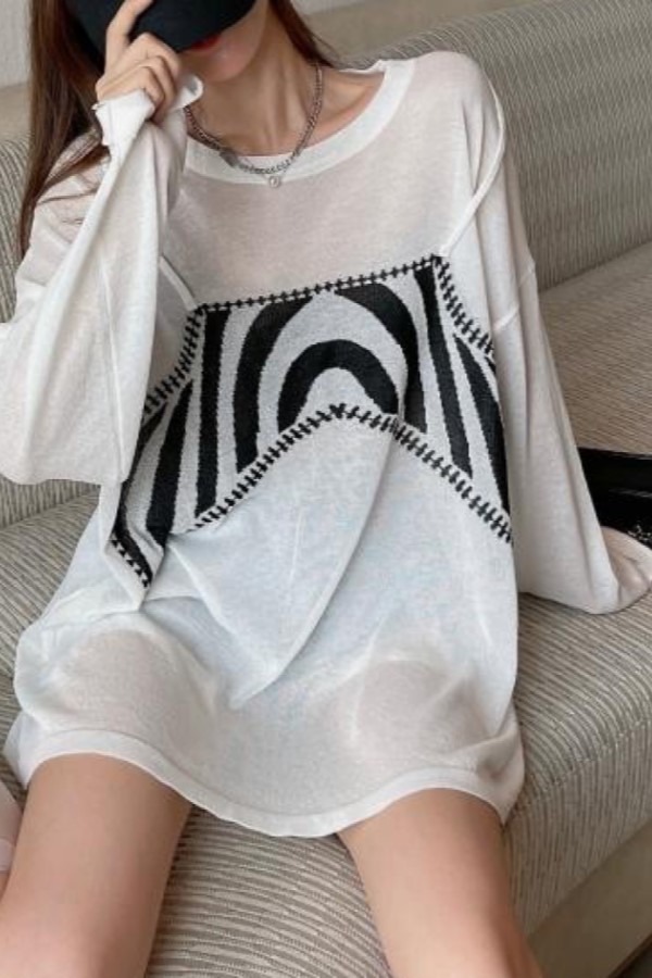 제나 지브라 패턴 페이크 두조각 라운드넥 긴팔 롱슬리브 오버핏 실키 탑