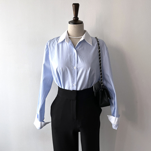 100% 면 스트라이프 배색 와이드 카라 루즈핏 남친 셔츠 2컬러
