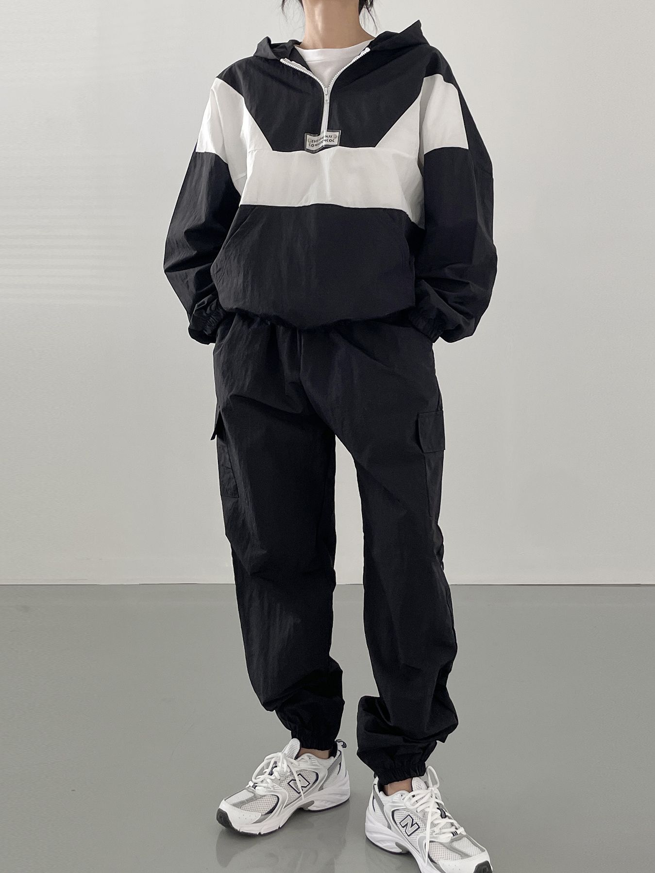 마크-바람막이SET (윈드브레이커, 트레이닝복 세트 아노락 후드반짚업 조거바지 ) (베이지, 검정) - Free, XL