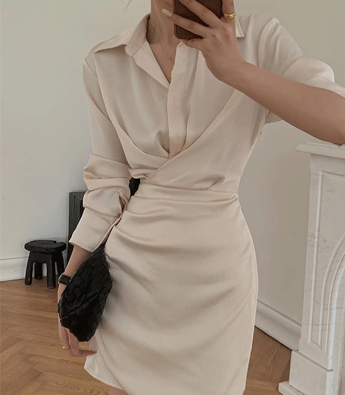 [샴페인 컬러 V넥 스커트 드레스 원피스] 슬라이트 언발란스 셔츠원피스 봄원피스 스커트 드레스 원피스 하객룩 개강룩 외출룩 데이트룩 비지니스룩 브라이덜샤워