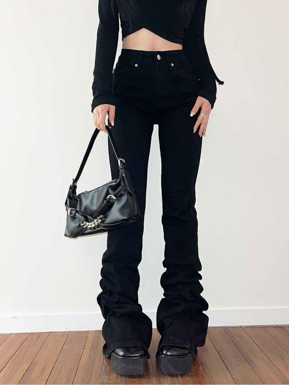 shirring black boots-cut pants | 셔링 하이웨스트 블랙 부츠컷 팬츠